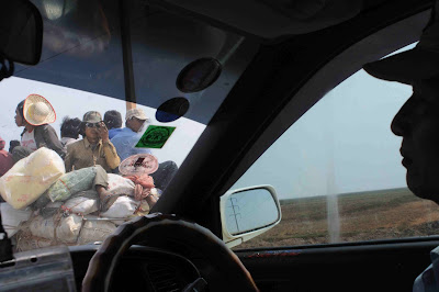 Passage through Thai departure area was a breeze because of the conversations. As I emerged in the heat, I see a dusty, seedy border town, run amok with cattle, goats, street urchins, push carts, tuk-tuks, taxis and shop stalls. I walk determinedly ahead, knowing nothing where to go yet giving the impression that I have been through this all many times before. I soon pass the three girls and the man, trying to board a taxi that apparently was waiting for them. I see from a distance a little office labeled, "visa". I go in there, fill up a short form, and give them a passport photo and $20. Two minutes and done. I take it down another 300 meters, where I fill in another form, and get the visa stamped in the passport. As I stand in the line I see the same Irish-nz couple ahead of me. I ask whether they are going to Siem Reap. They say no, they will return to Bangkok today. I do not ask what the hell they were doing here, out of politeness. They ask whether I booked my taxi, and say it will be a bumpy ride to Siem Reap. I confess that I haven't figured that part yet. A woman in late fifties, obviously cockney, who is on the parallel line tells me that that's where she is going too, and whether I would like to share. I am relieved. She says her boyfriend is a Cambodian, who is going with her, and the three of us can share the fare. Sure thing. The boyfriend arrives. Pierre is a polite Cambodian (do they make a rude Cambodian? Not yet. Who knows) with a young face, hardly 35. We stuff our packs/bags in. I move to the front, they take the back. I ask whether shops here take small bhats because I lost my water bottle. The woman offers a bottle that she has extra. We pay $10 each to the middleman who had arranged the taxi and we will pay $14 each to the driver when we reach Siem Reap. Considering that the book says it should cost $40-50 to Siem Reap this sounds like a really good deal. The toyota has a very comfy front seat. We bump along violently and relentlessly through the dusty straight as an arrow road where every km or so there is small bridge being built so we take a little diversion around it.